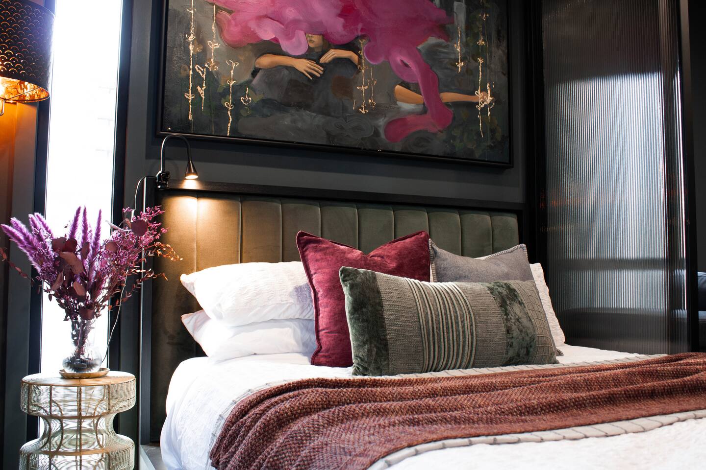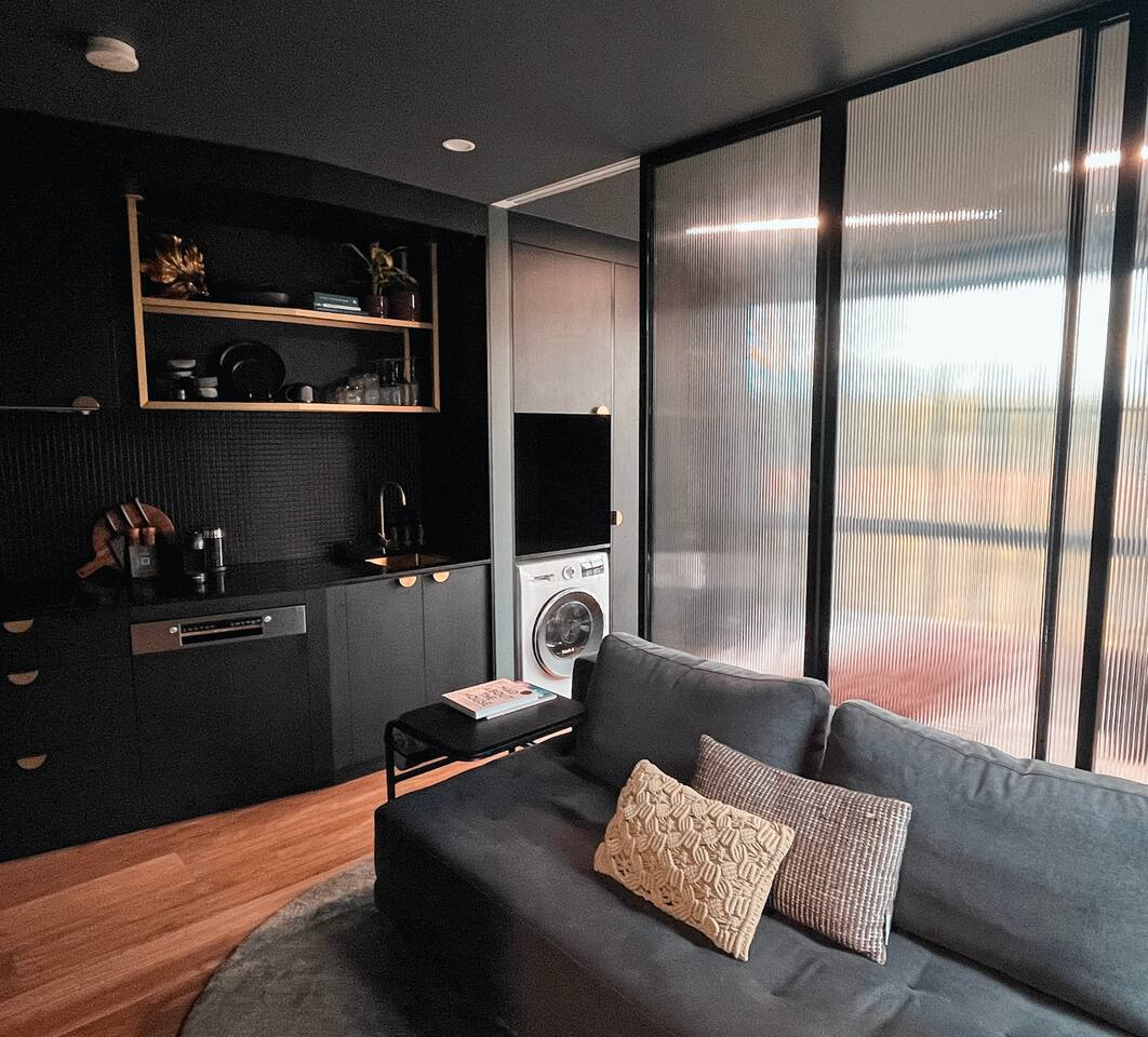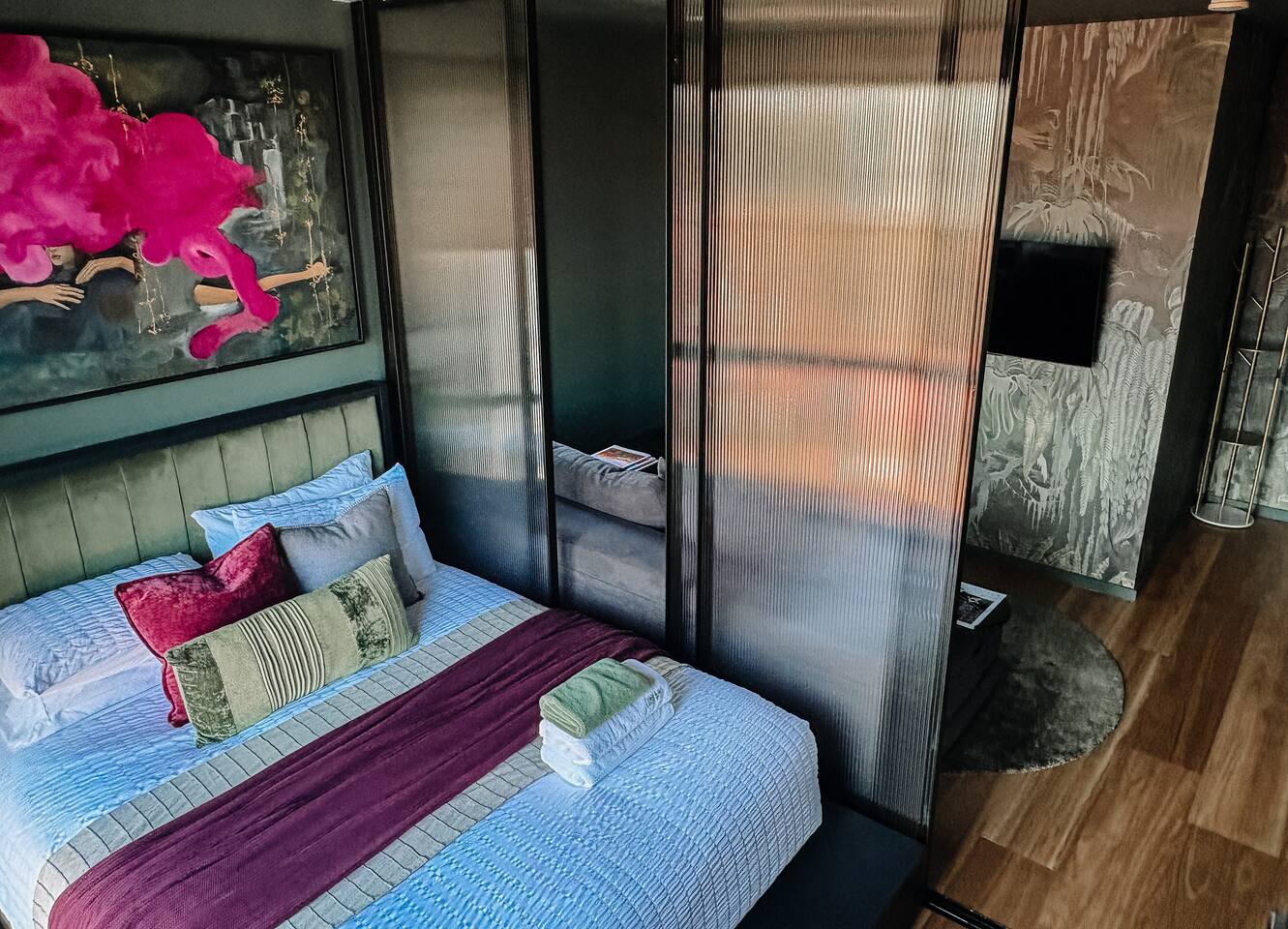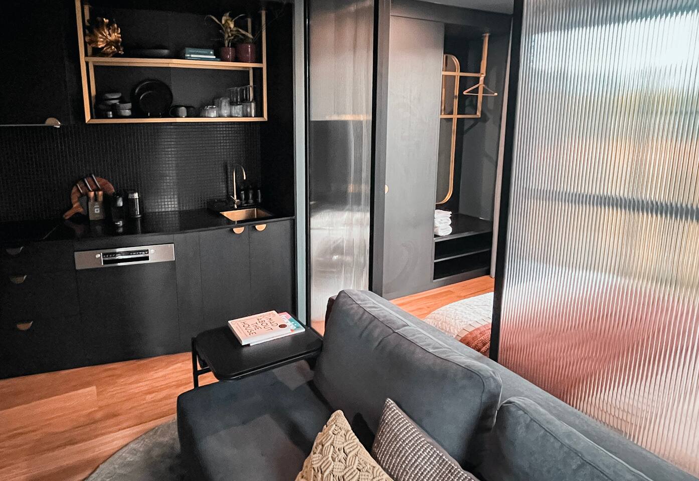 Soft muted tones, designer wallpaper, and custom magenta artwork fuse to engage your senses in the 'Lagoon' micro-apartment. Purpose made for comfort and relaxation, this tiny home-inspired retreat boasts a fully equipped mini kitchen, bespoke joinery, and luxury finishes. Enjoy treeline views and curated design that transport you to a 'lagoon' state of mind. With a playful boutique hotel vibe and all the comforts of home, 'Lagoon' invites you to effortlessly embrace holiday or staycation mode.